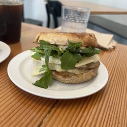 I'd say 4.5/5 but gets bumped up because the service was extremely friendly and enthusiastic and it met my very high expectations. I love Thomas and his English muffins but these are really in a different league. Exceptionally chewy and airy. Super moist and flavorful. Honestly a perfect bread for the sandwich. Held up incredibly to the rich garlic butter and egg. Usually don't like cheddar in a breakfast sandwich but its sharpness paired great with the salty butter. Two nitpicks: I wish the tomato played a larger role. The slices were small and thin -- I was hoping for more it to star. Also $10 for a pretty basic sandwich is a little steep. Highly recommend. The shop was a little small but would be a great spot for a relaxing cafe breakfast.